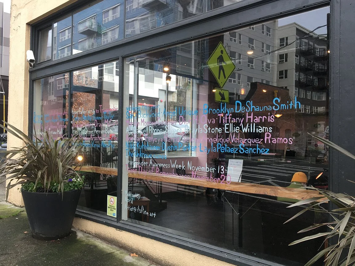 Names of some of the Trans people lost in the year 2020. Painted on the windows of Gay City in Seattle Washington.